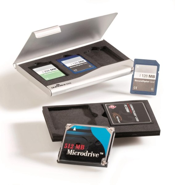 Eleganckie etui na karty pamięci do aparatów cyfrowych z matowego aluminium. Z dwoma wymiennymi wkładkami dla bezpiecznego przechowywania 3 kart Secure Digital (SD) / kart MultiMedia (MM) o formacie 24 x 32 x 2 mm lub 2 kart Compact Flash (CF) / Microdrives w formacie 36,5 x 43 x 3 mm.
