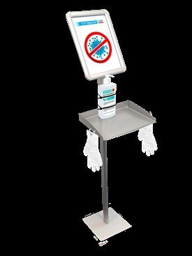 Stojak z ramką plakatową zatrzaskową i półką np. na płyn dezynfekcyjny.